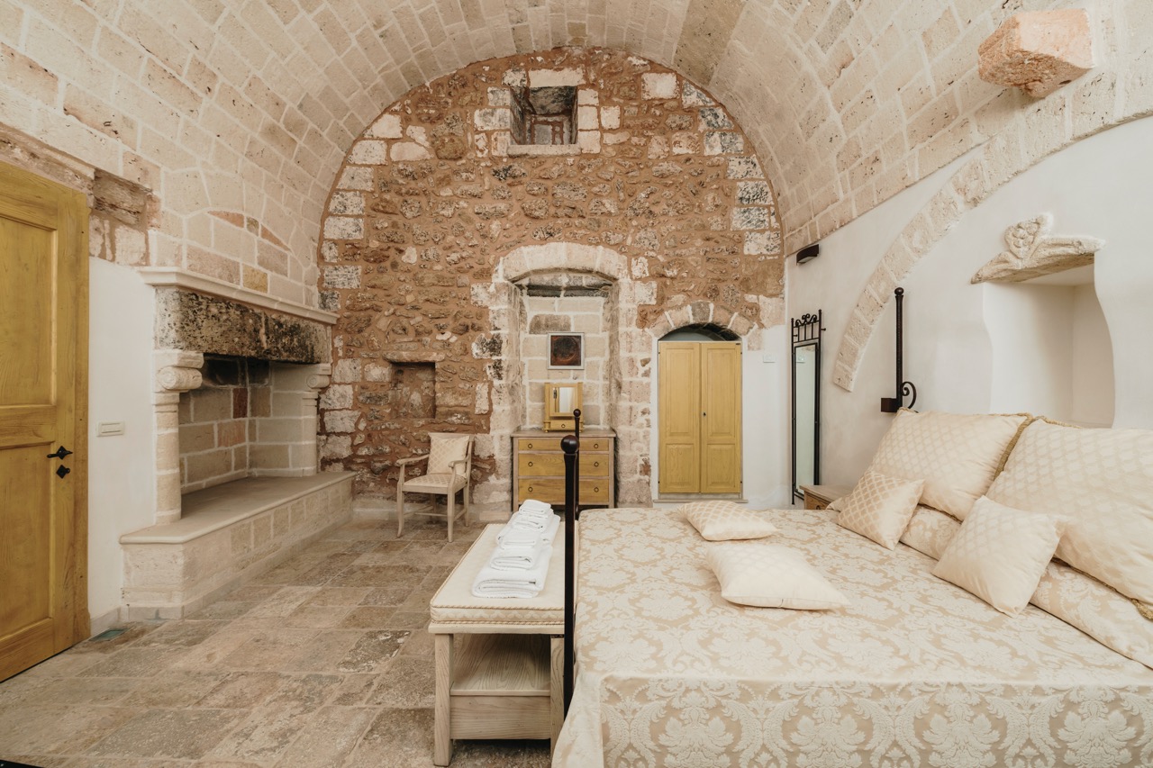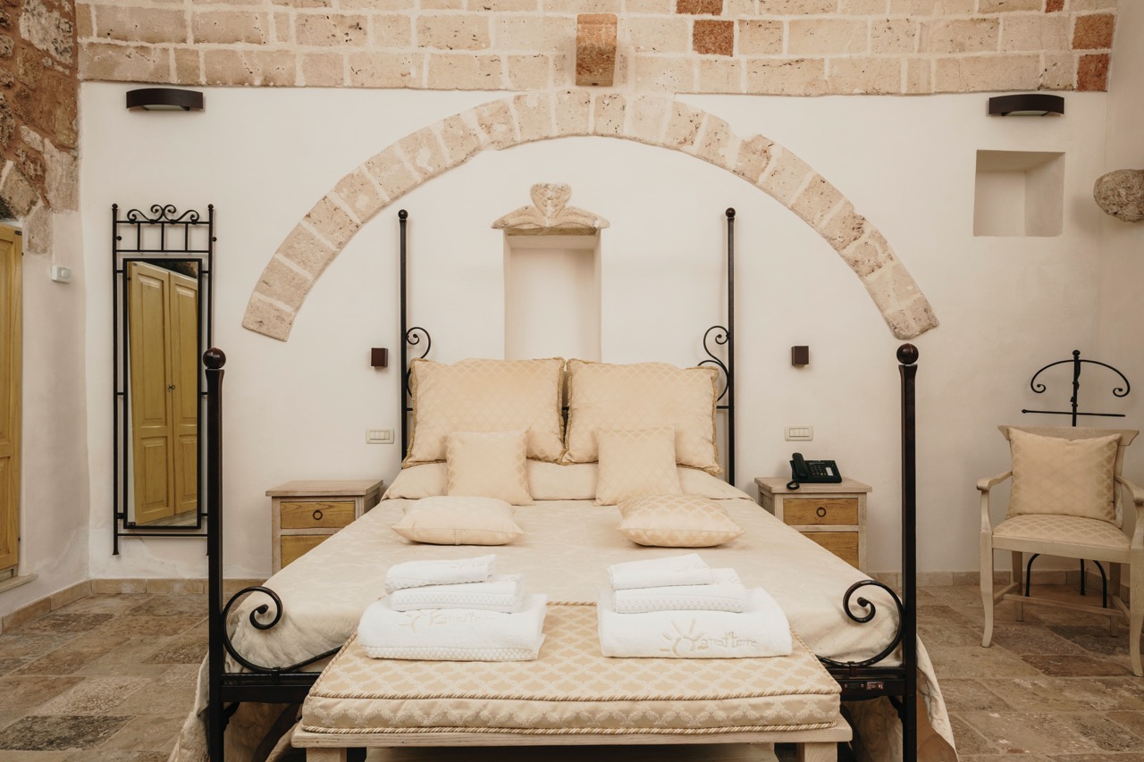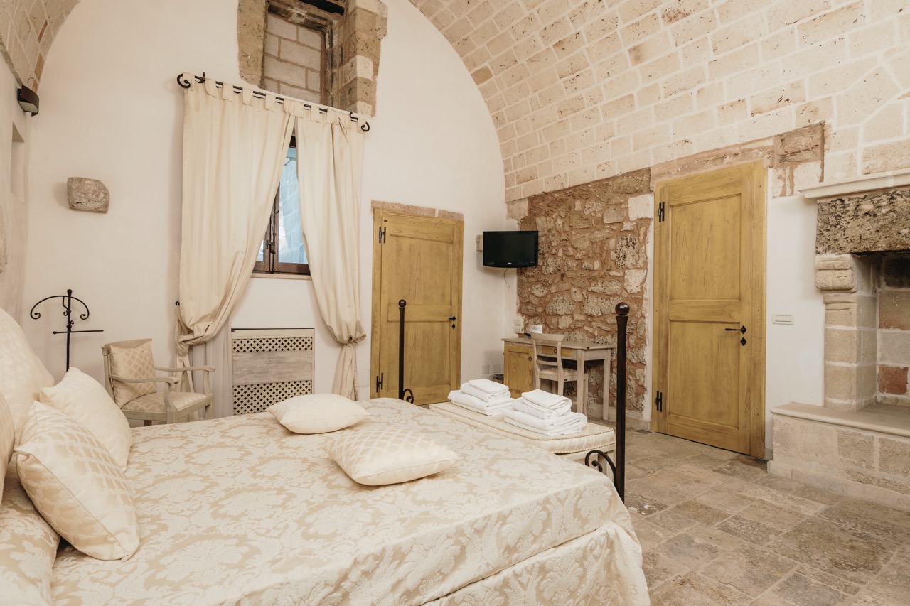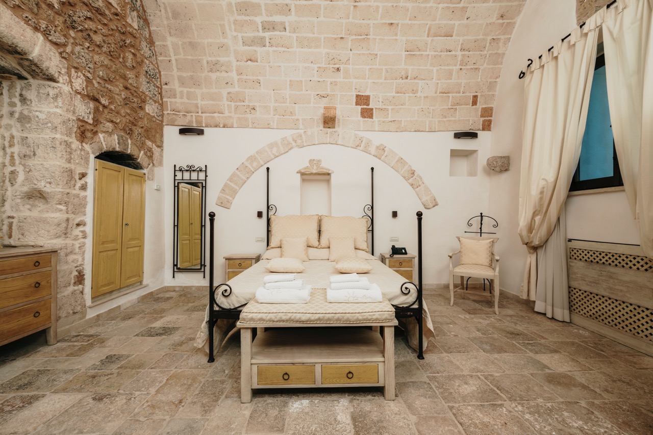 La Suite Strazzati è l’ambiente più distintivo della masseria: due spazi ampi e armoniosi, collegati tra loro, che combinano autenticità rurale ed eleganza essenziale. L’arredo tradizionale si unisce alla morbidezza dei colori naturali, creando un ambiente ricco di atmosfera. Il piccolo balcone, presente in alcune sistemazioni al primo piano, offre un punto privilegiato da cui osservare il silenzio della campagna. È la camera ideale per chi desidera un soggiorno raccolto, familiare e profondamente legato al ritmo lento di questo luogo.